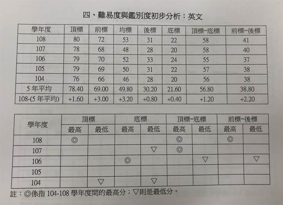 102 年大學指考各科五項成績標準(五標) 【聯合新聞網 整理】 科目 頂標 前標 均標 後標 底標 年度 102 年 101 年 102 年 101 年. 科目 頂標 前標 均標 後標 底標 國文 69 64 54 44 36 英文 79 69 50 31 22 數學甲 75 65 47 27 15 數學乙 87 78 60 36 25 化學 83 73 55 37 28 物理 83 73 54 37 27 生物 82 76 64 48 36 歷史 77 72 61 50 41 地理 70 64 56 46 40 公民與. Aug 16, 2021 · 受到國內疫情爆發影響,末代指考今(16)日終於放榜,考生可於上午9點起上網查詢成績,各科五標、人數百分比累計表等資料一併公布,其中不少考生試後哀嘆連連的物理、化學科頂標與去年相比下跌,物理更是… Jul 29, 2021 · 末代大學指考英文科,全教會110指考英文科評論教師群認為,今年考題選文多元,詞彙難度增加,尤其英文作文考大學教授全英文授課,恐有城鄉落差,雙峰現象恐更明顯,預估5標微幅下降。全教會英文科評論老師包括台北市立大同高中老師劉郁芬、台北市立和平高中老師温宥基、台北市立明倫. Jul 30, 2021 · 一一 年指考國文科為末代考科,明年初學測考過國文後,七月將不再重複施測,高中教師分析今年壓卷題引學者論述,將米、飯、酒的變化應用,拿來譬喻國文科教材與試題間的應用延伸,應是預示一一一年學測準備方向。預估五標為頂標七十八分、前標七十一分、均標五十九分、後標四十六分.